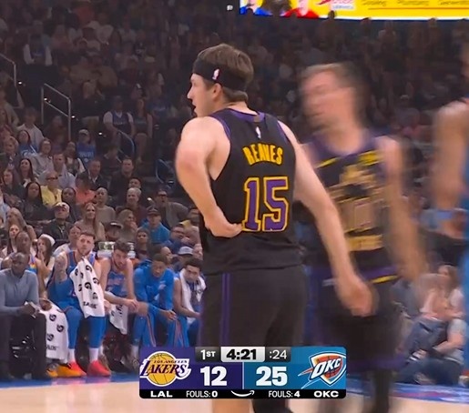 据湖人队记Dave McMenamin报道,里夫斯在暂停结束后直接回到更衣室接受检查。